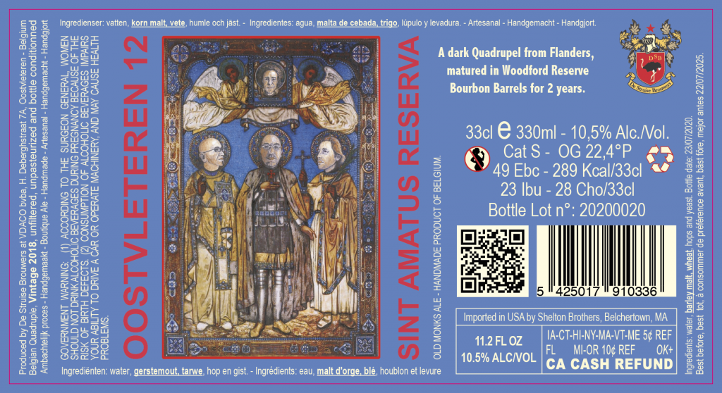 A Sint Amatus Reserva é a Cerveja que se obtém do processo de envelhecimento em barricas de Bourbon e Cabernet Sauvignon da Cerveja Pannepeut, a escura cerveja-mãe do estilo quadrupel que é produzida pela Struise há já tantos anos. Enraizada na rica tradição das Cervejas quadrupel trapistas belgas, esta cerveja ganha uma dimensão superior através do envelhecimento prolongado em barricas de Bourbon Woodford Reserve. Embora a Cerveja Pannepeut seja já uma verdadeira quadrupel, uma Cerveja escura, forte e complexa por si só, a Sint Amatus eleva esta base a um nível superior, fruto do tempo e da acção da madeira. Após aproximadamente dois anos de envelhecimento em barricas de Bourbon de carvalho americano recém-esvaziadas, a cerveja sofre uma verdadeira transformação: torna-se mais profunda, mais aveludada e ainda mais adequada à degustação calma e com deleite. O envelhecimento em barrica não se sobrepõe à cerveja base, mas entrelaça delicadas notas de baunilha, carvalho tostado, côco e Bourbon quente com a rica estrutura de malte.